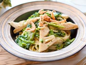 菜の花と茹でたパスタを加えてソースと絡め、粉チーズ、塩・こしょうを加えて味を調える。