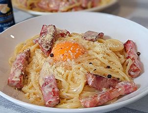 生クリームを使わず、ホワイトソースを使ったカルボナーラ。